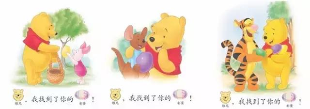 再次,为这个时期的孩子都喜欢重复做一件事,重复读一个故事,所以家长在为孩子选择图书的时候,要选一些句式重复、字词重复率高的故事。诸如《迪士尼我会自己读第1级找彩蛋》中那句“维尼,我找到了你的彩蛋!”通过小熊维尼的五个好朋友之口,说了五次。